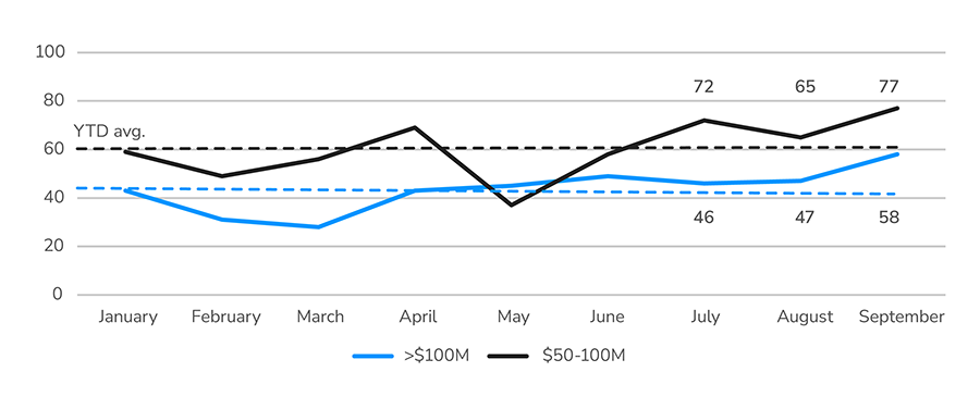 LightBox tracked nearly $27 billion in total CRE transactions in September, marking the busiest month of 2025. At the high end of the spectrum, nine-digit deals above $100 million rose 23% month over month, running 34% above the year’s monthly average. Mid-cap transactions between $50 million and $100 million rebounded 18% from August’s dip and surpassed July levels to set a new high point for the year.